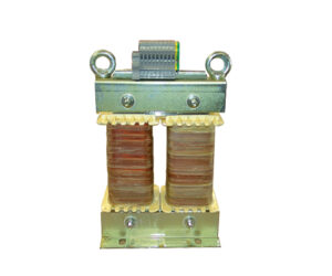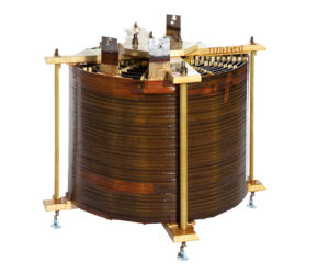 Charge inductive triphasée à réglage continu, composée d’un transformateur variable triphasé à colonnes et d’une bobine d’inductance triphasée à noyau de fer connectée en aval côté secondaire, pour le test de convertisseurs et d’alimentations avec courant réactif.
